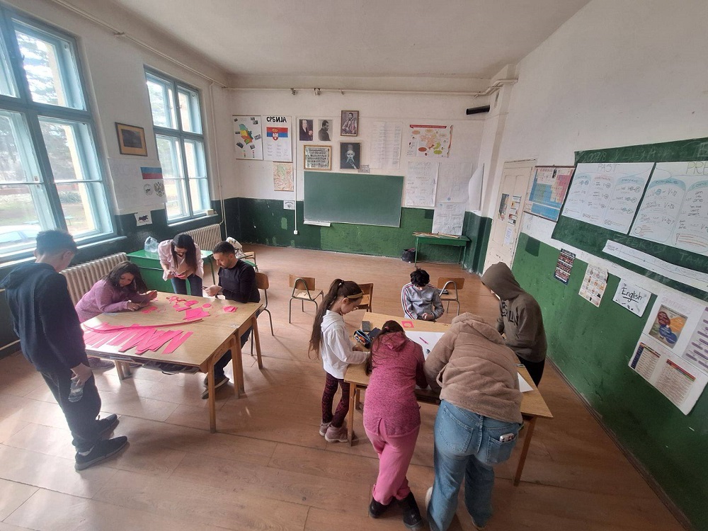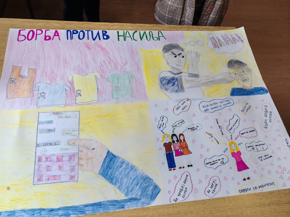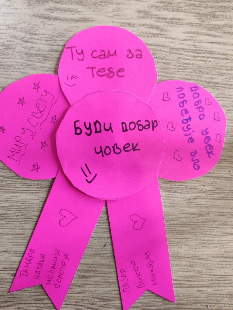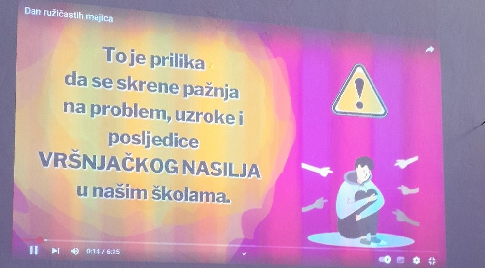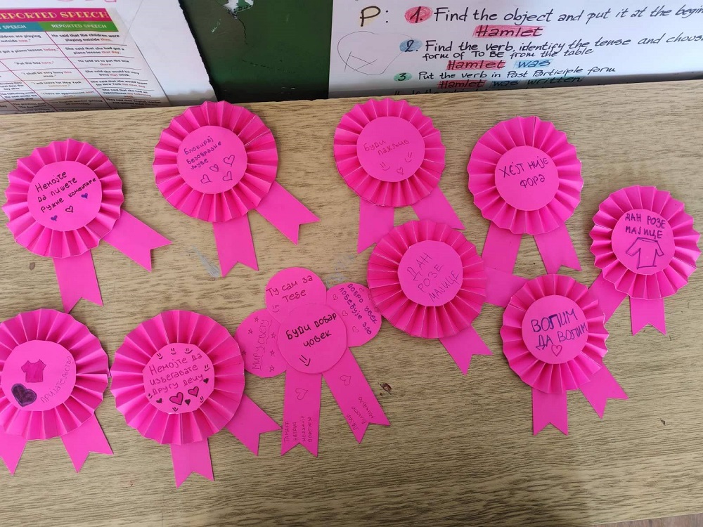 Дан розе мајица је наша школа обележила и радионицом коју су организовали представници Стручног тима за заштиту ученика од насиља, дискриминације, злостављања и занемаривања у сарадњи са наставником ликовне културе. Овом приликом говорило се о озбиљности проблема вршњачког насиља, његовим облицима, начинима како га препознати и како помоћи жртвама. Ученици свих разреда су учествовали у изради постера и прављењу беџева и на тај начин промовисали сарадњу и заједништво и послали поруке мира, љубави и пријатељства.